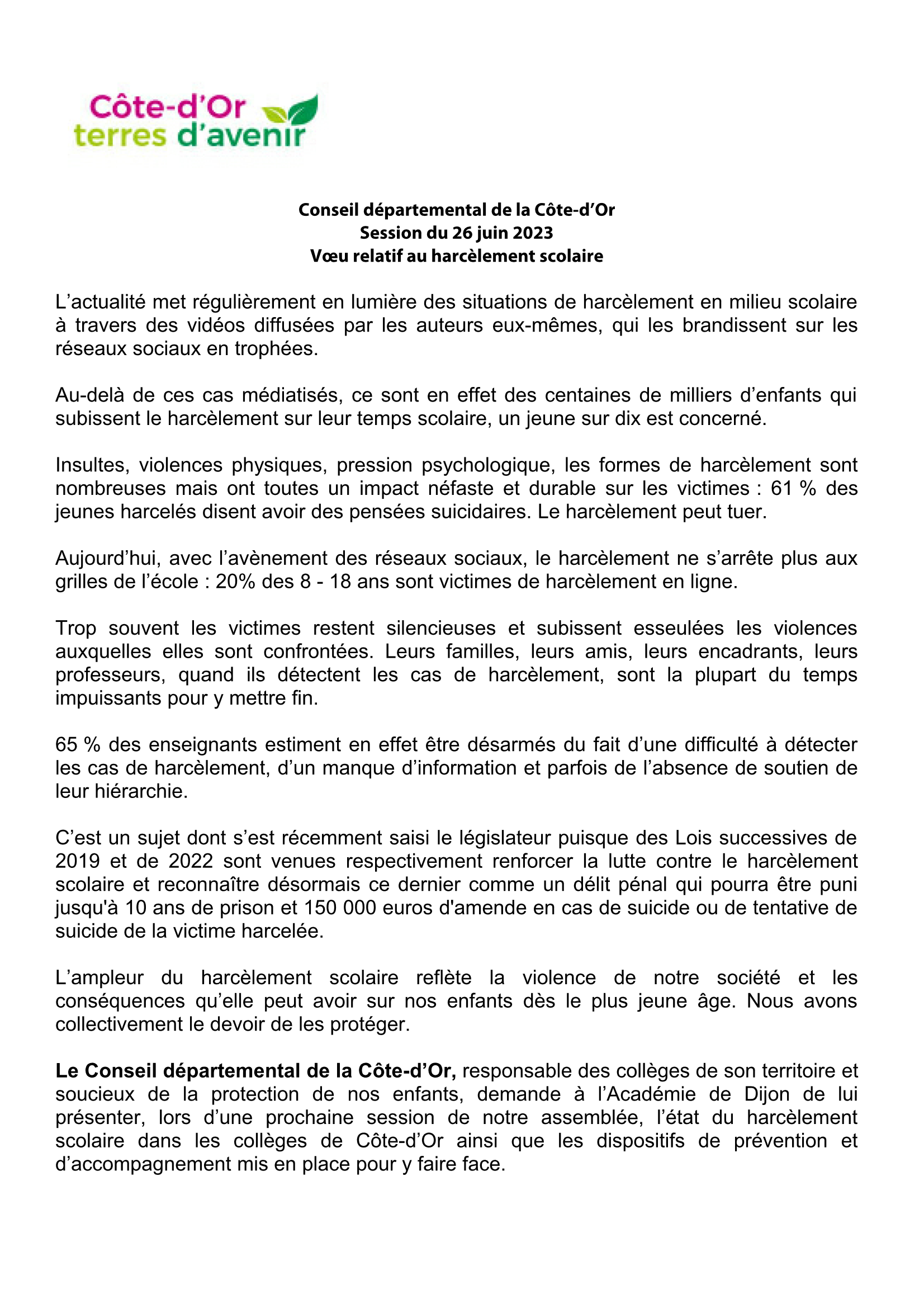 Deux voeux ont été présentés que vous pouvez retrouver ci-dessous dans leur intégralité : un relatif au harcèlement scolaire dans les collèges, adopté à l’unanimité, et un second voeu pour le respect des dispositions de la Convention des droits de l’enfant vis à vis des mineurs étrangers accueillis en France, repoussé à une discussion ultérieure.